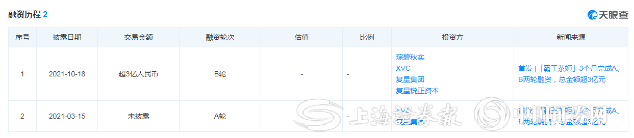 天眼查信息显示,霸王茶姬在2021年完成A、B两轮融资,合计超过3亿元。其中,A轮融资由XVC和复星集团联合领投,B轮融资由琮碧秋实领投,其他老股东跟投。