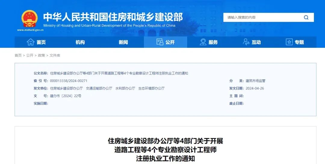 近日,住建部、交通运输部、水利部、生态环境部四部门发布了《关于开展道路工程等4个专业勘察设计工程师注册执业工作的通知》。