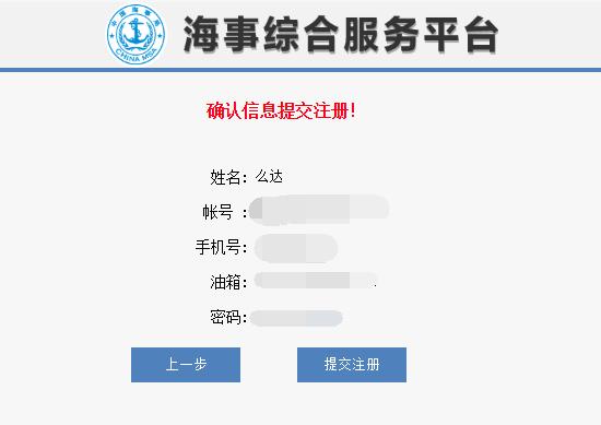 点击“下一步”操作,显示您提交注册的详细信息,包括:姓名、账号、手机号、邮箱、密码;点击“提交注册”提交注册信息,点击“上一步”返回到填写密码阶段。