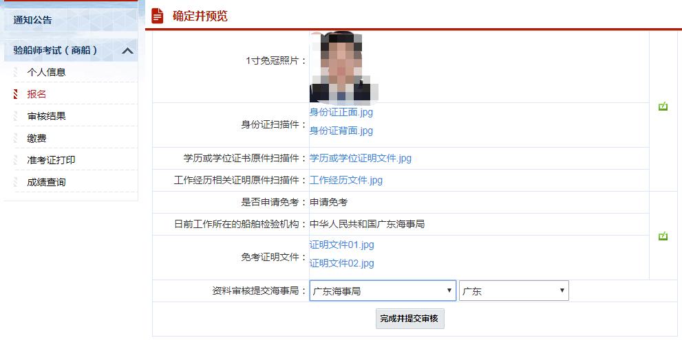 4、确定并预览,进入预览画面,点击“超链”可以查看您所上传的图片信息。点击“编辑”图标,可以回到对应的步骤修改报名信息。选择资料审核提交的海事局信息,提交给对应的海事局进行审核。