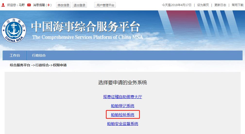 2、点击“权限申请”超链,选择“船舶检验系统“权限。