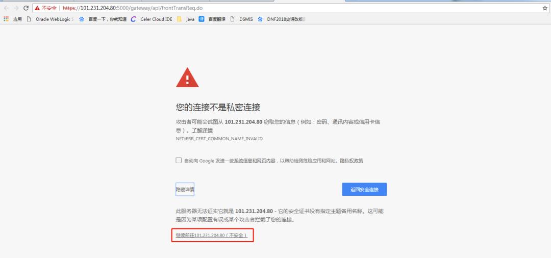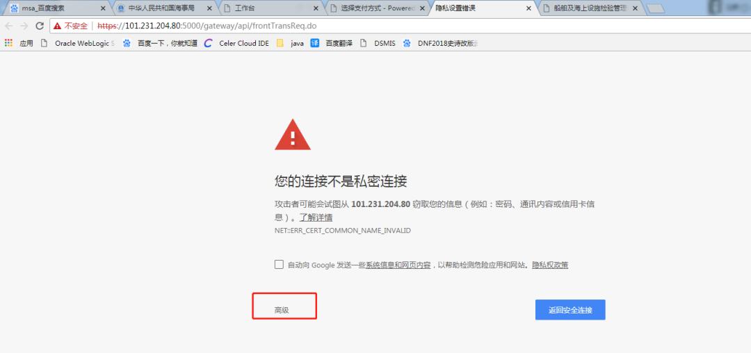 点击“确认支付”后,可能会出现访问“不是私密链接”,点击“高级”,再点击“继续前往101.231.204.80(不安全)”。