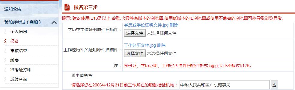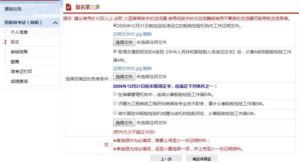 3、报名第三步,上传验船师考试所需的图片或者扫描件等资料。可以勾选“申请免考”,申请免考资格。这里也可以返回上一步,对的数据进行修改。注意:所有报名人员本次都需提交证件照及相关证明文件。证件照为1寸,底色为白色,jpg格式,像素为295*413,大小在10K至30K以内。附件大小在50KB至512KB之间,如果有多张图片的请合成一张上传。