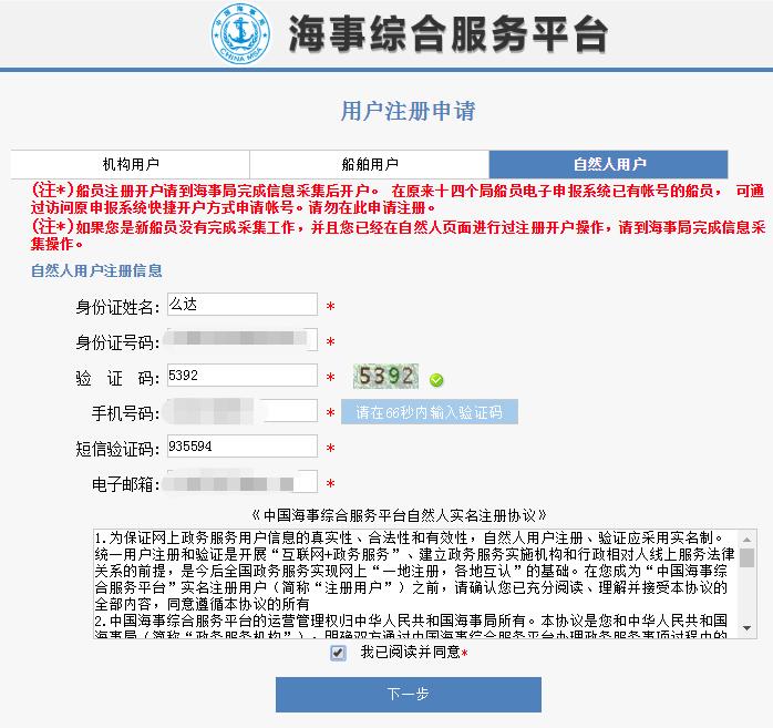 “点击进入综合服务平台”超链,欧博进入到中国海事综合服务平台登录页面,点击“用户注册”,选择自然人用户注册,填写相关信息。