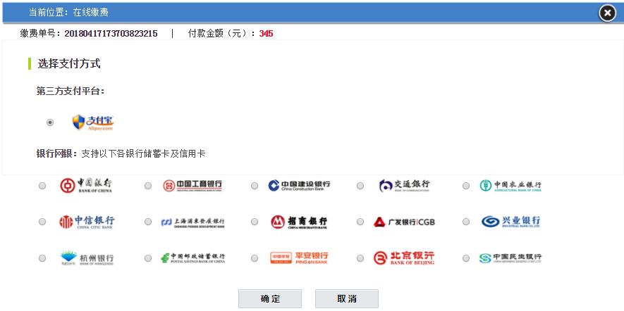 3、点击“确认”按钮,进入缴费页面,选择支付方式,进行支付。(具体操作详见附件一)