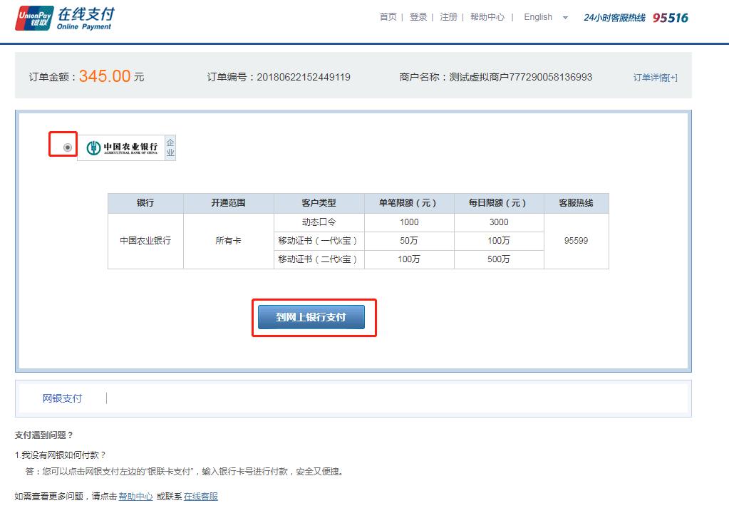 选择“中国农业银行”,再点击“到网上银行支付”。