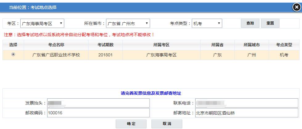 点击“关闭”按钮,则回到缴费页面,显示该考生分配的考位信息以及考试科目。