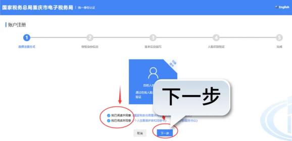02 阅读《国家税务总局重庆市税务局用户使用协议》《个人信息保护告知同意书》《人脸识别服务协议》后,勾选【我已阅读并同意】,点击【下一步】。