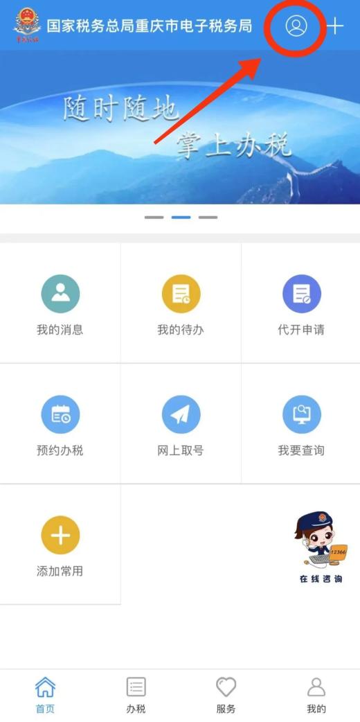 02 打开重庆税务APP首页,点击右上角圆形图标进入登录界面。