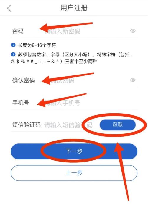 04 设置登录密码,输入手机号,点击【获取验证码】并输入提示框,然后点击【下一步】。