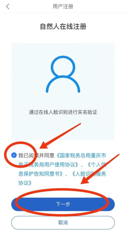 04 阅读《国家税务总局重庆市税务局用户使用协议》《个人信息保护告知同意书》《人脸识别服务协议》后,勾选【我已阅读并同意】,点击【下一步】。