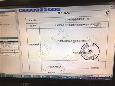 北青报记者在“北京工商e网通服务平台”上查询发现,有限责任公司申请办理执照需要提供住所使用证明,具体为“产权人签字或盖章的房产证复印件。产权人为自然人的应亲笔签字,产权人为单位的应加盖公章”。